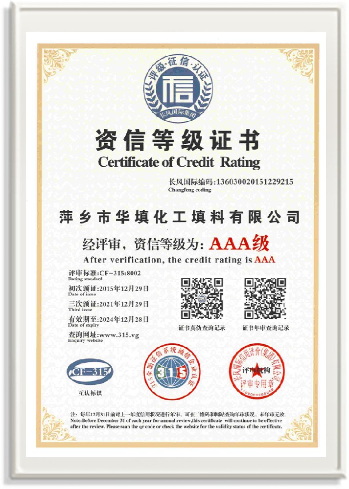萍鄉(xiāng)市華填化工填料有限公司,位于320國道、109國道、浙贛鐵路、昌金高速公路貫穿其中,交通便利,是江西西部一顆燦爛明珠,創(chuàng)建于20世紀(jì)70年代初期,是中國石油天然氣股份有限公司“能源一號(hào)網(wǎng)”會(huì)員企業(yè)、中國石化物資采購電子商務(wù)網(wǎng)絡(luò)和中國海洋石油總公司采辦業(yè)務(wù)系統(tǒng)成員單位,是上海大學(xué)江西材料基因組工程產(chǎn)業(yè)研究院工業(yè)陶瓷產(chǎn)業(yè)創(chuàng)新聯(lián)盟基地,且通過ISO9001:2015質(zhì)量管理體系、ISO14001:2015環(huán)境管理體系、ISO45001:2018職業(yè)健康安全管理體系認(rèn)證的化工填料生產(chǎn)企業(yè)。公司擁有陶瓷、塑料、金屬填料、催化劑、活性氧化鋁、分子篩等產(chǎn)品生產(chǎn)線,現(xiàn)有固定資產(chǎn)3616萬元,占地面積3.8萬平方米。公司具有悠久的生產(chǎn)歷史、雄厚的技術(shù)力量和先進(jìn)的生產(chǎn)工藝設(shè)備,可生產(chǎn)工業(yè)瓷球(支撐劑)、陶瓷、金屬、塑料質(zhì)的規(guī)整、散堆化工填料及分子篩、催化劑、生化濾料、活性氧化鋁、石化助劑、活性炭、環(huán)保材料、耐火材料等系列的200多種規(guī)格型號(hào)產(chǎn)品。